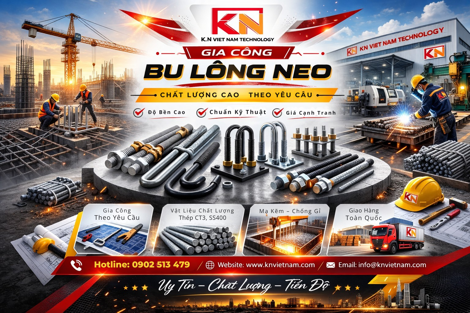 KN Việt Nam là đơn vị chuyên gia công bu lông neo theo yêu cầu với tiêu chuẩn kỹ thuật cao, đáp ứng đa dạng nhu cầu của khách hàng trong lĩnh vực xây dựng và cơ khí.